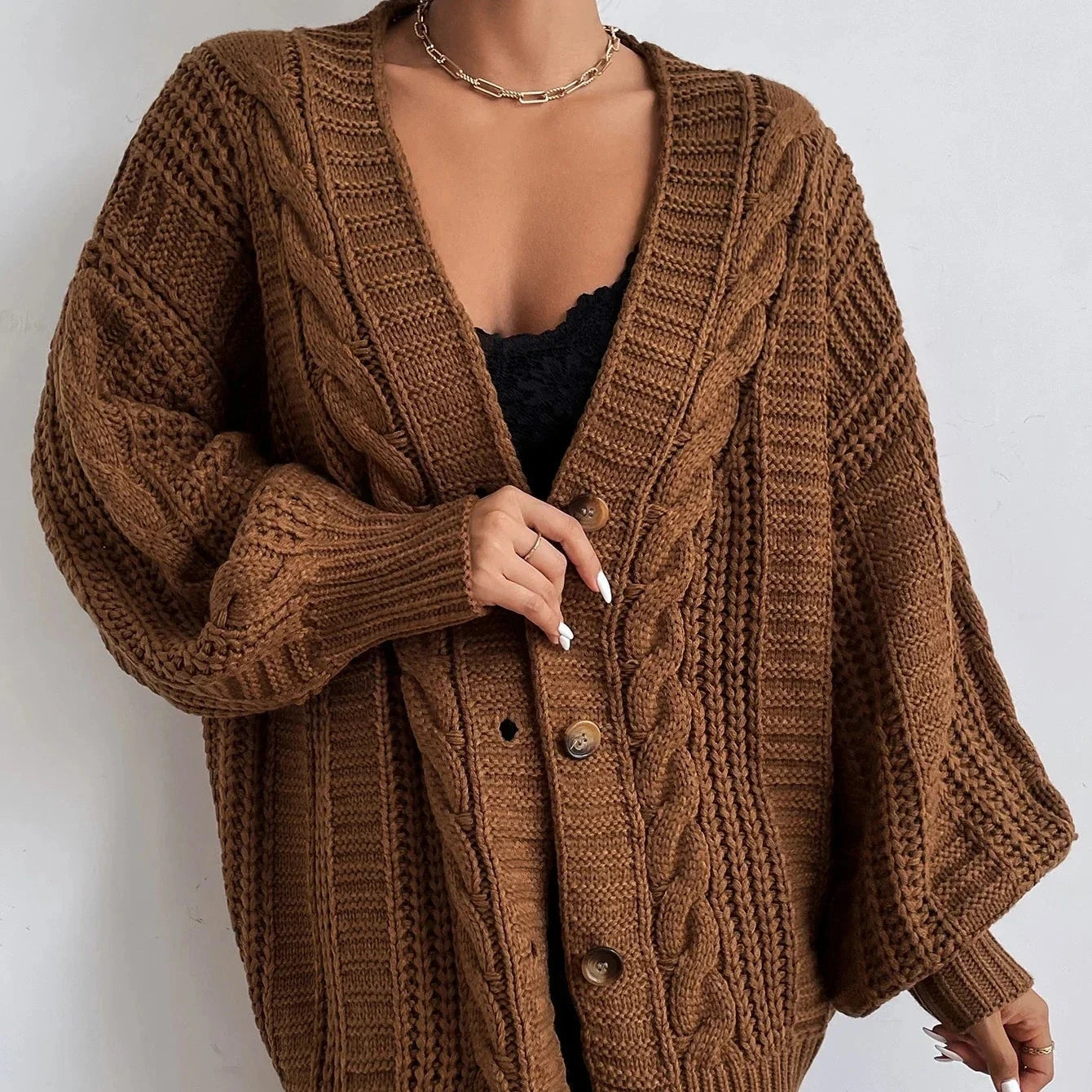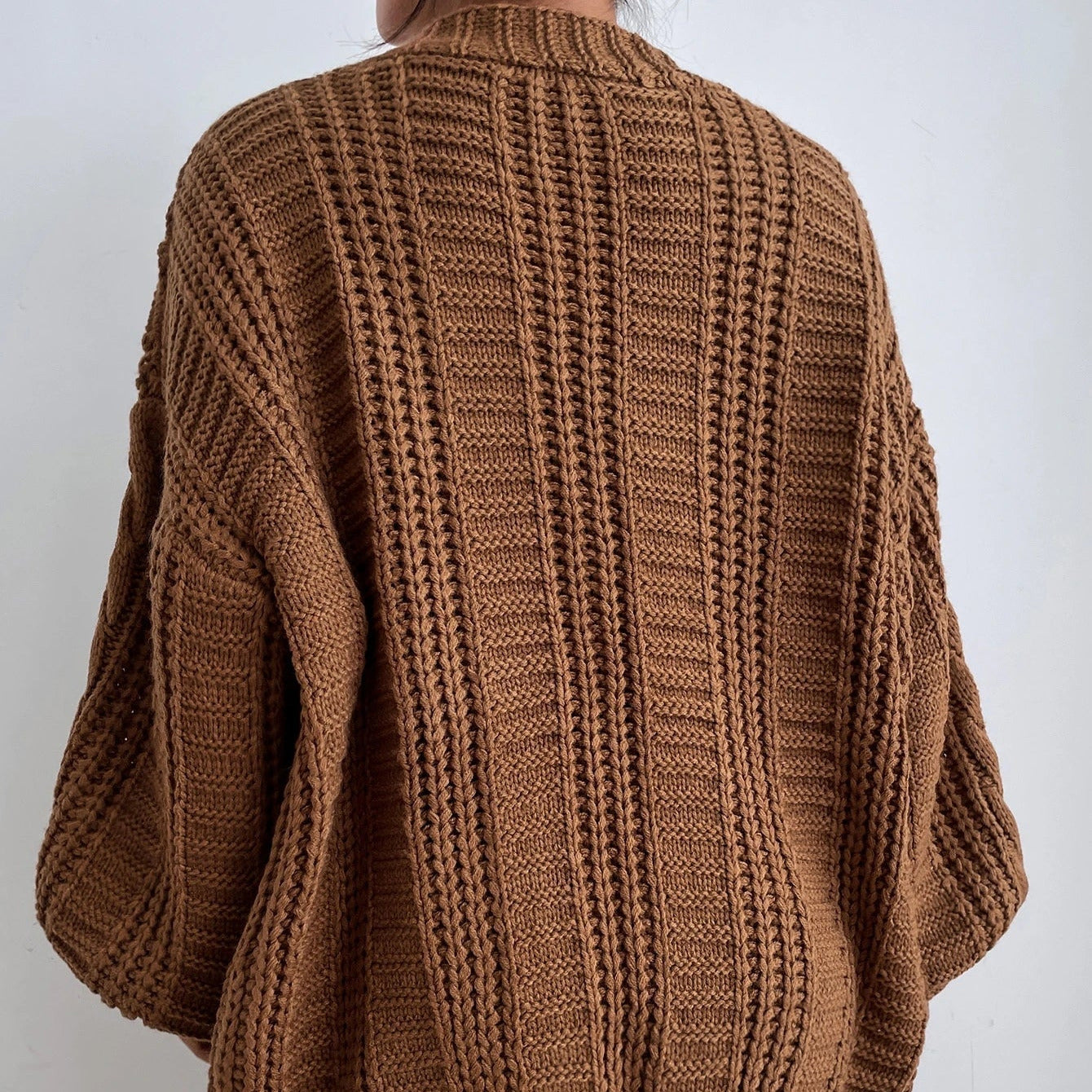 Sperimentate il massimo comfort con questo accogliente cardigan in maglia a cavi, disegnato con cuciture grosse e una vestibilità oversize rilassata per un'atmosfera rilassata. L'orlo a coste e la profonda abbottonatura frontale aggiungono un tocco di stile, rendendolo perfetto per essere indossato sopra un dolcevita o abbinato ai vostri jeans preferiti. Disponibile in una varietà di colori che si adattano al vostro stile personale, questo cardigan è un'aggiunta essenziale al vostro guardaroba per le giornate fresche e le notti fredde.